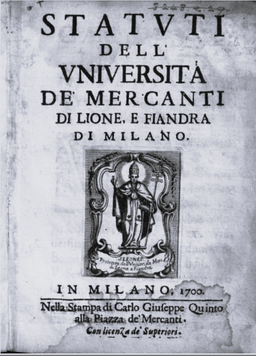 Statuti dell’Università de’ Mercanti di Lione e Fiandra di Milano , nella stampa di Giuseppe Quinto alla Piazza dei Mercanti, 1700. Milano, Archivio di Stato, Atti di governo, Commercio , p. a., b. 259