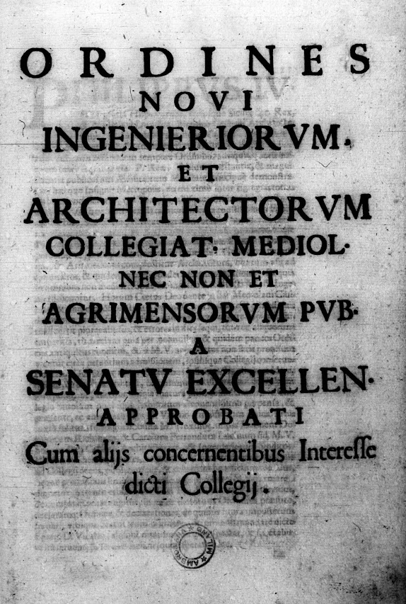Il frontespizio riprodotto precede una raccolta degli ordini di ingegneri e architetti risalente a una data immediatamente successiva all’agosto 1703, che è l’ultima menzionata nella raccolta, a stampa senza data. L’università degli architetti e agrimensori è costituita nel Cinquecento, con decreto del Vicario di Provvisione del 16 dicembre 1563 ed emanazione definitiva il 6 settembre 1565 (sarà costituita in collegio nel 1603), ma all’interno della universitas erano già stati approntati degli Ordines novi ingenierorum et architectorum collegiatorum Mediolani nec non et agrimensorum publicorum fin dal 1558 . La normativa fu più volte rivista tra Cinque e Settecento con disposizioni che ricalcano nello schema altri statuti corporativi: attenzione è prestata all’immatricolazione, che deve essere preceduta dalla «militatione», vale a dire dalla pratica presso un ingegnere, architetto o agrimensore immatricolato (per 6 anni se ‘candidati’ ad essere ingegneri o architetti, per 4 se aspiranti agrimensori) oltre dall’attestazione di essere ‘oriundo’ della città di Milano, provata da una serie di ‘fedi’ e, per ingegneri ed architetti, l’attestato che «nè loro, ne suo Padre, ò Avo paterno per trent’anni avanti la dimanda habbino essercita alcuna arte vile, o meccanica». L’ ‘esame’ dell’immatricolando, con risposte a questi anche su matematica e geometria e prove pratiche in campagna prevede ‘esaminatori’ «attenti e pesati» nelle loro valutazioni.