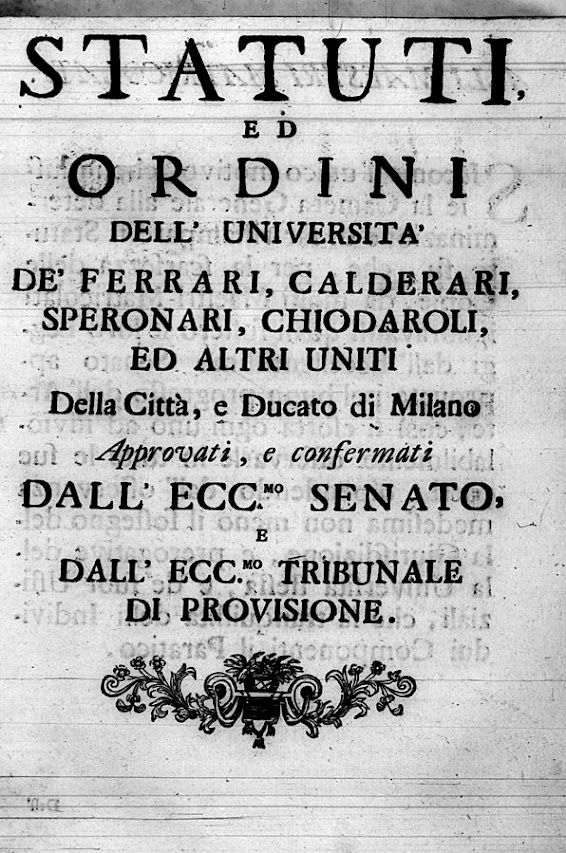 Statuti, ed ordini dell’Università de’ Ferrari, Calderari, Speronari, Chiodaroli, ed altri uniti della Città e Ducato di Milano approvati e confermati dall’Ecc.mo Senato di Milano e dall’ Ecc.mo Tribunale di Provvisione , s.a., ma non ante 1733
