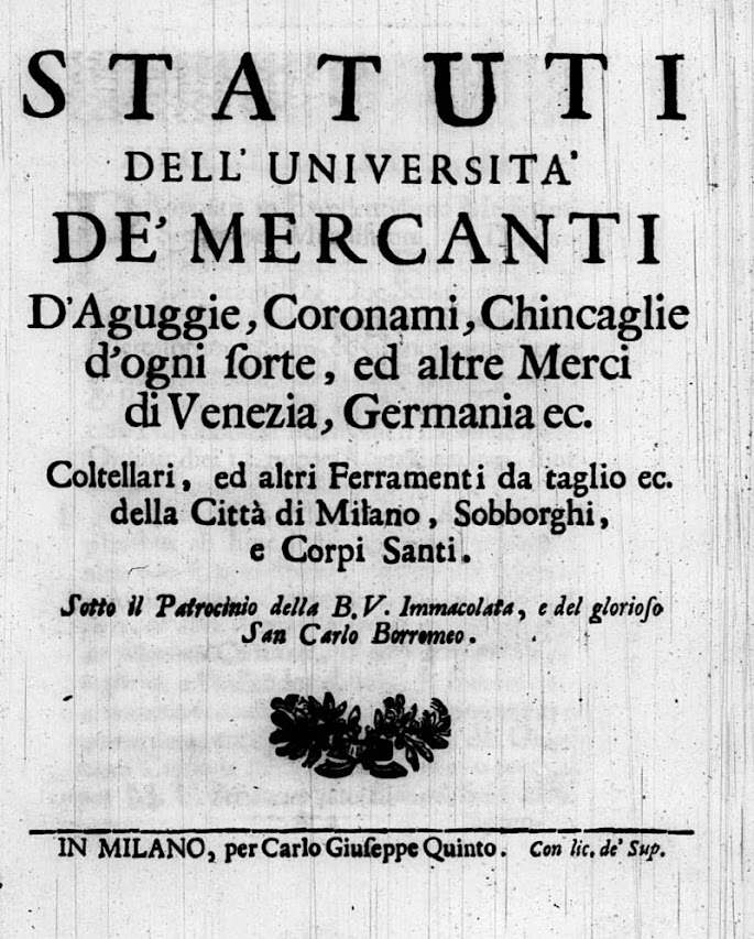 Statuti dell'università dei mercanti d'aguggie, coronami, chincaglie d'ogni sorte, ed altre merci di Venezia, Germania ec... , Coltellari ed altri Ferramenti da Taglio, ec… Milano, per Carlo Giuseppe Quinto, 1741